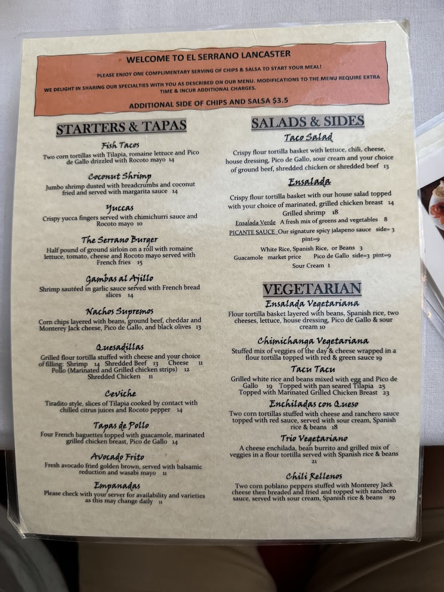 Introducing the vibrant menu of El Serrano, located at 2151 Columbia Ave, Lancaster, PA, this restaurant stands out with its authentic flavors and delightful ambiance. The menu offers a variety of tantalizing options that cater to every taste.